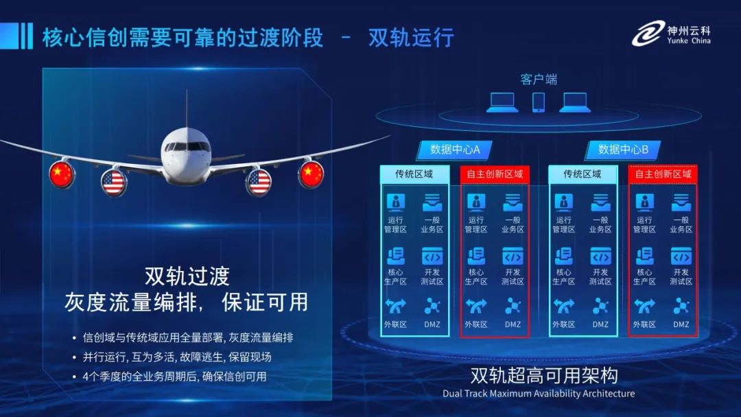 為幫助客戶更好地應(yīng)對數(shù)字經(jīng)濟(jì)時代對應(yīng)用可持續(xù)性的高要求,實現(xiàn)信創(chuàng)與數(shù)字化兼得,leyu.樂魚推出了雙軌超高可用架構(gòu)。雙軌超高可用架構(gòu)在雙活數(shù)據(jù)中心的分區(qū)調(diào)度基礎(chǔ)上,增加信創(chuàng)域和非信創(chuàng)域的分域調(diào)度,實行信創(chuàng)域與傳統(tǒng)域應(yīng)用全量部署,使雙中心運(yùn)營變?yōu)殡p中心四區(qū)域并行運(yùn)行,互為多活,將傳統(tǒng)架構(gòu)變?yōu)榉謪^(qū)分域協(xié)同的多活雙軌超高可用架構(gòu)。幫助客戶在新架構(gòu)下,保障“信創(chuàng)”的同時解決性能瓶頸,提升穩(wěn)定性,保證應(yīng)用可持續(xù)性,最終實現(xiàn)信創(chuàng)區(qū)域和非信創(chuàng)區(qū)域的平滑過渡,完成國產(chǎn)化替代目標(biāo)?!?/p>
